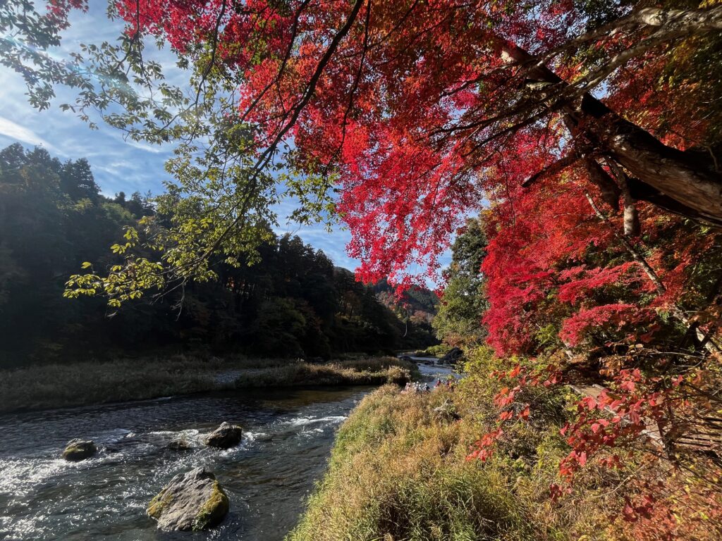 青梅の御岳渓谷にハイキングに行ってきました。軍畑駅を降りて、トコトコ歩いて御岳渓谷遊歩道へ。川の音を聞きながら、気持ちよく歩いていくと、綺麗な紅葉が。