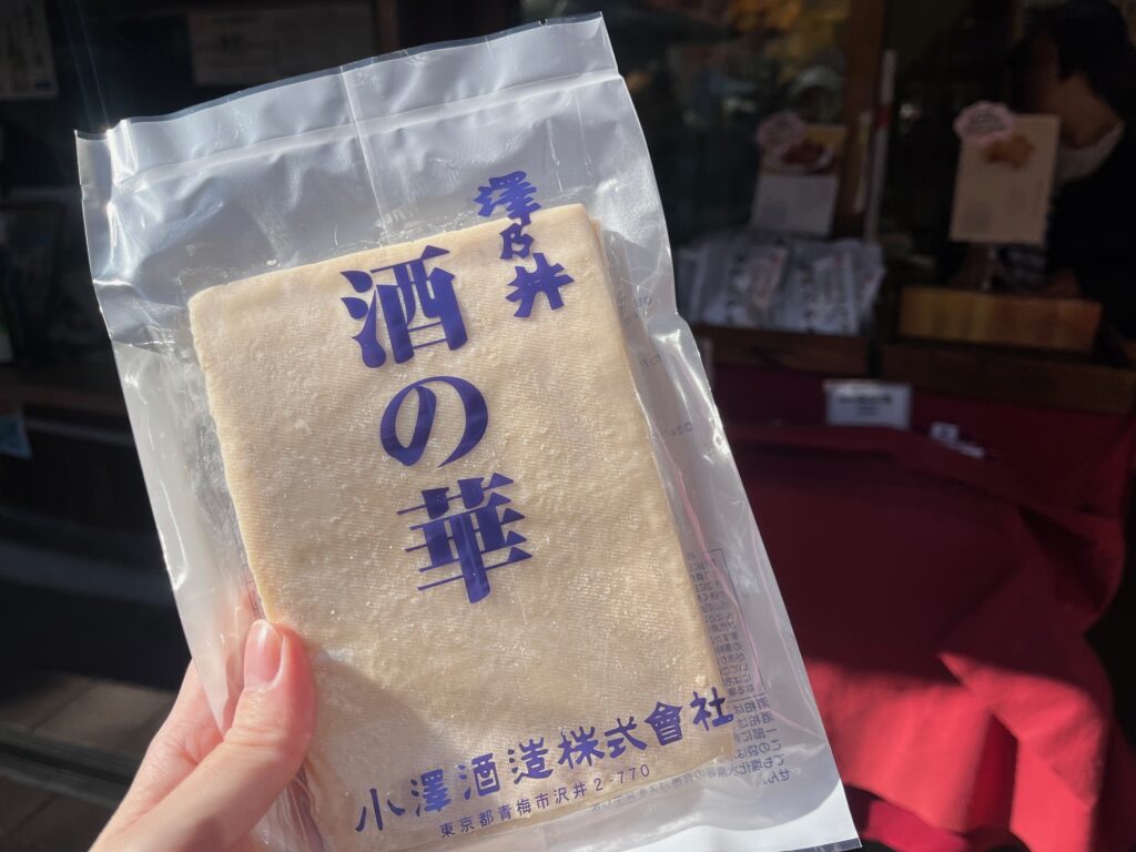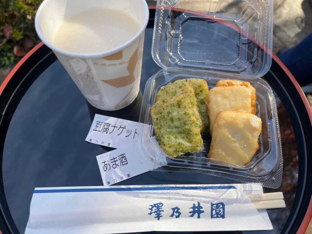 紅葉を眺めながらしばらく歩いて、途中にある清流ガーデン澤乃井園さんへ。売店で甘酒(さすが酒造の甘酒、とっても美味しい!)と豆腐ナゲットを食べてひと休み。お土産に酒粕も購入出来ました。